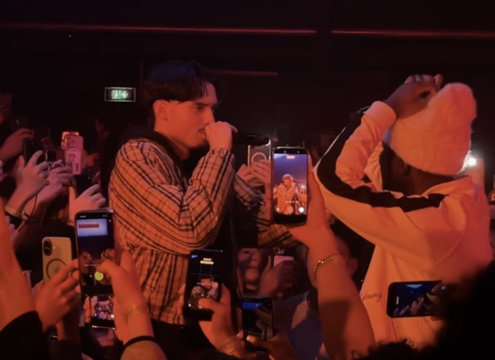 Après une courte pause musicale animée par le DJ, c’est R2 qui entre en scène. Il chante plusieurs morceaux de son nouvel album, dont Jamais Toi (2025) et +91 (2025). Il y a tellement d’ambiance qu’il fait monter quelques fans sur scène avec lui. Et petite surprise : il invite RnBoi à le rejoindre pour chanter leur remix du son BTRD (2025). R2 a ensuite laissé le micro à RnBoi, déjà bien habitué aux showcases, pour interpréter le morceau qui l’a fait percer : MON BÉBÉ (2025) – évidemment, tout le monde connaissait les paroles ! Avant de partir, R2 interprète Ruinart (2025) son morceau le plus streamé (plus de 100 millions d’écoutes sur Spotify), laissant la foule en délire : le public chante le refrain si fort que R2 baisse son micro et absorbe la scène.